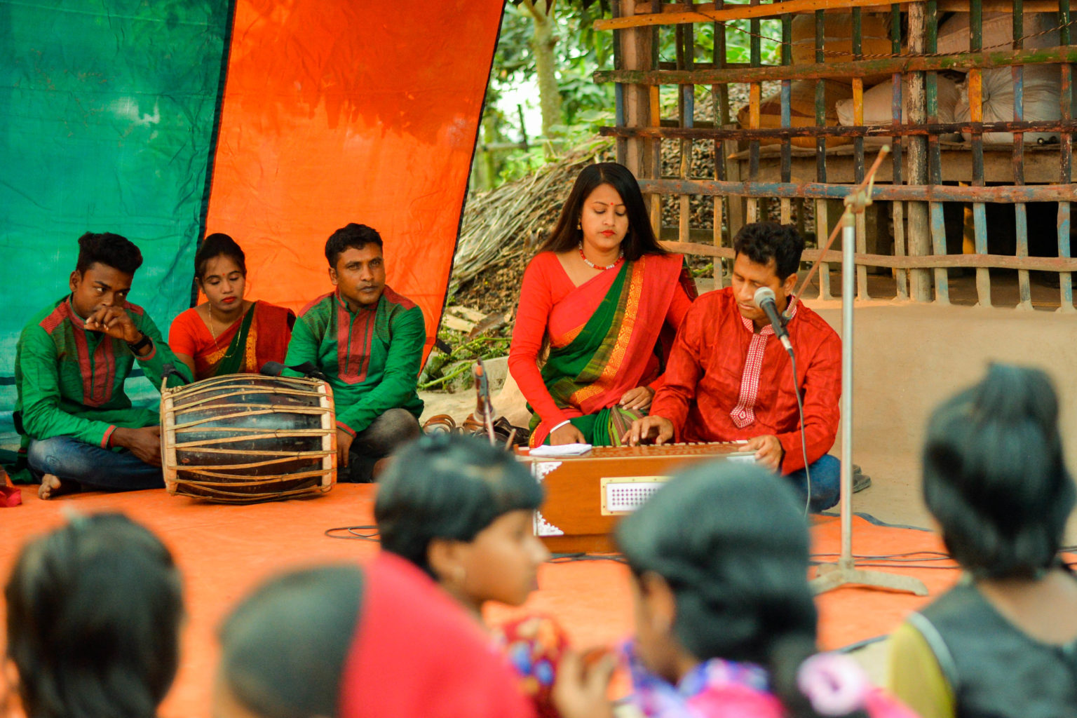 Shagorika and her team usually perform during winter on the premises and courtyard of the house of a rich person or a leader of a village. Tents are set up, and an audience gathers and sits on mats on the ground as the performance goes on. Normally, the team would travel from one village to another to present their stories, but the pandemic has grounded them to their local area.